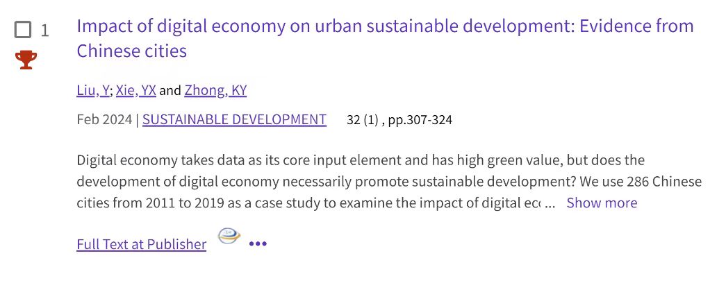根据ESI最新公布的数据显示,公司经济系教师刘洋以第一作者在《Sustainable Development》发表的题为“Impact of digital economy on urban sustainable development: Evidence from Chinese cities”的SSCI期刊论文,入选ESI高被引论文,进入全球前1%论文之列。