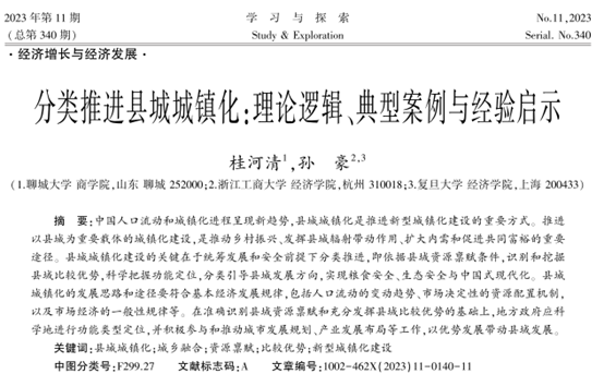 公司教师桂河清发表在《学习与探索》2023年第11期上的一作论文《分类推进县城城镇化:理论逻辑、典型案例与经验启示》被人大复印《区域与城市经济》2024年04期全文转载。