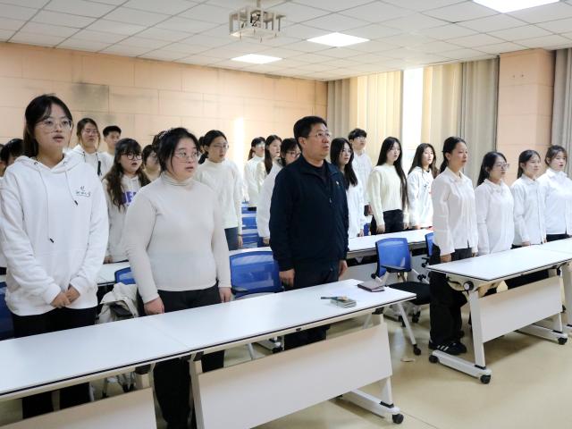 刘玉华向新团员致以热烈祝贺,强调团员身份不仅是头衔更是责任。他提到,作为青年团员,一要心里有杆秤,走对路,深学党的理论,明辨是非、坚定方向,将个人理想融入国家发展大局,让青春不迷茫;二要手里有真本事,练好功,扎实学好商科专业知识,积极参与学科竞赛、志愿服务等实践活动——在志愿服务中践行社会责任,以专业所长赋能基层发展、助力民生改善,在知行合一中锤炼担当精神,在历练中增长才干;三要做人有好样子,当表率,以团员标准严格自律,团结同学、乐于助人,从遵守纪律、文明有礼等小事做起,争做先锋表率。最后鼓励新团员以入团为新起点、牢记誓言。仪式最后,全体人员起立齐唱《光荣啊,中国共青团》,为此次仪式画上圆满句号。