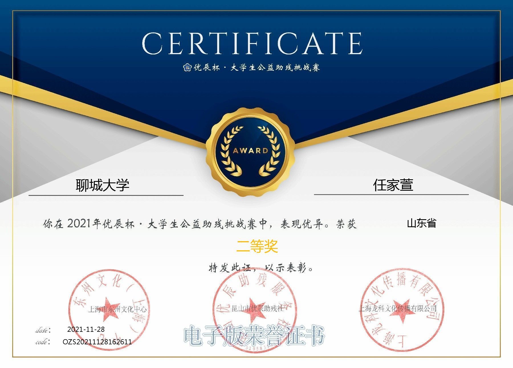 任家萱于2021年11月28日荣获2021年优辰杯老员工公益助残挑战赛山东省二等奖