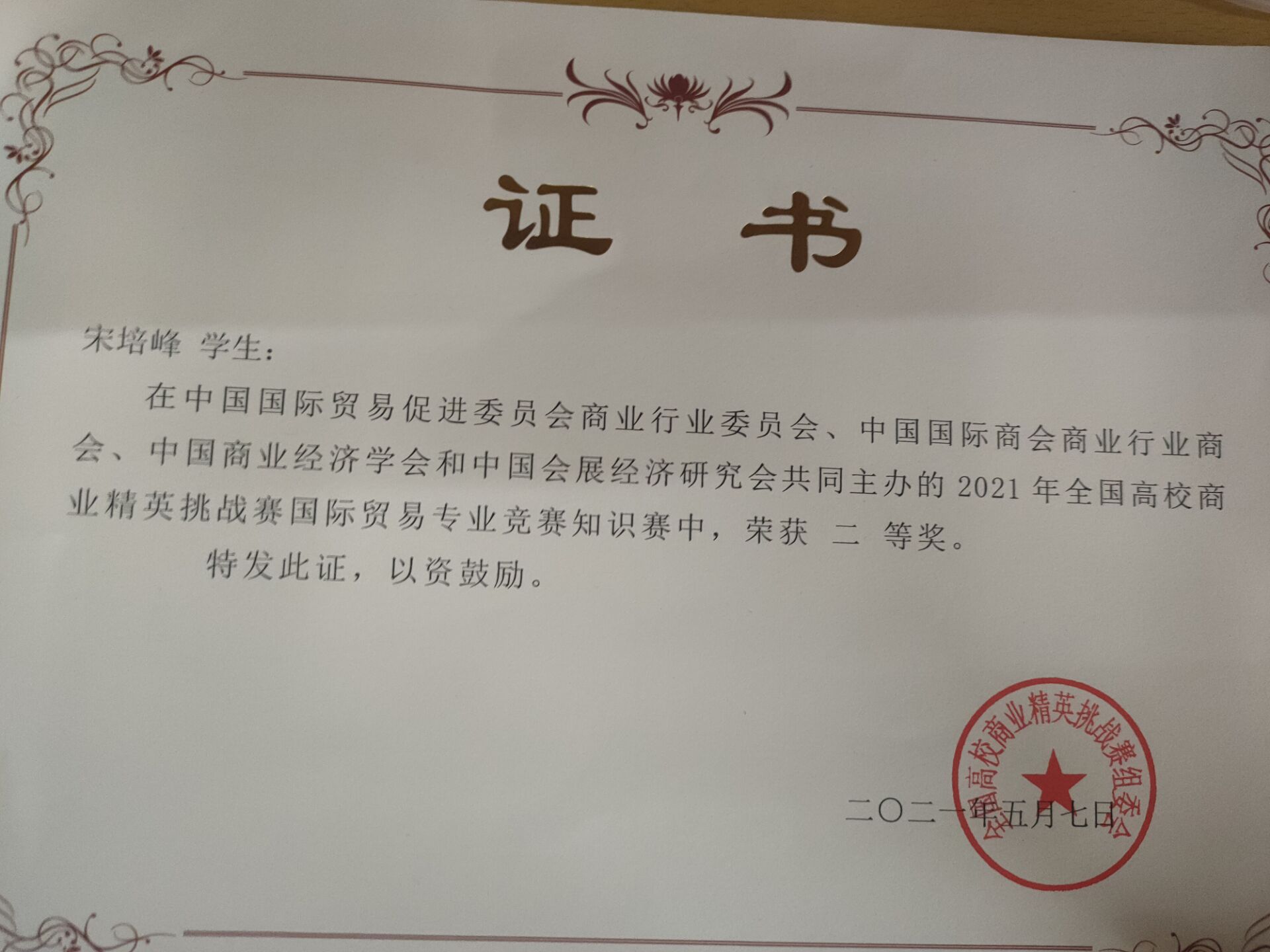 宋培峰于2012年5月7日荣获2021年全国高校商业精英挑战赛国际贸易专业知识竞赛二等奖