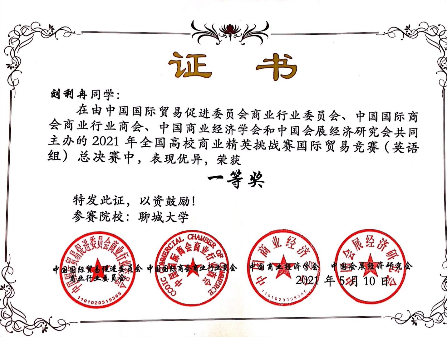 刘利冉于2021年5月10日荣获2021年全国高校商业精英挑战赛国际贸易竞赛(英语组)总决赛一等奖