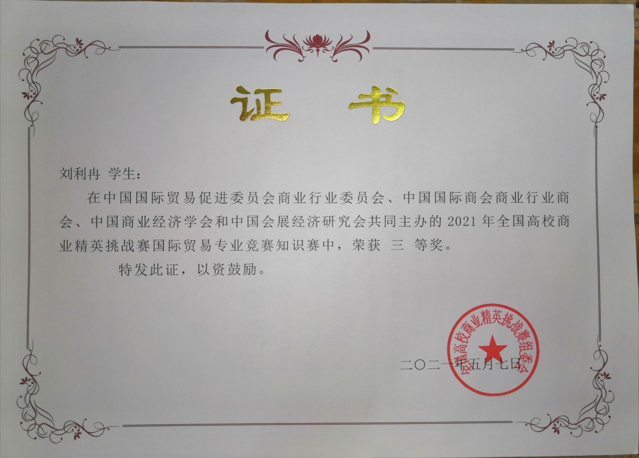 刘利冉于2021年5月7日荣获2021年全国高校商业精英挑战赛国际贸易专业知识竞赛三等奖