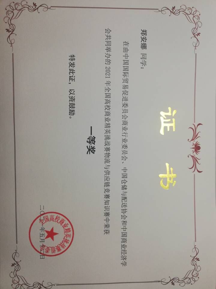 郑安娜于2021年5月12日荣获2021年全国高校商业精英挑战赛物流与供应链竞赛知识赛一等奖