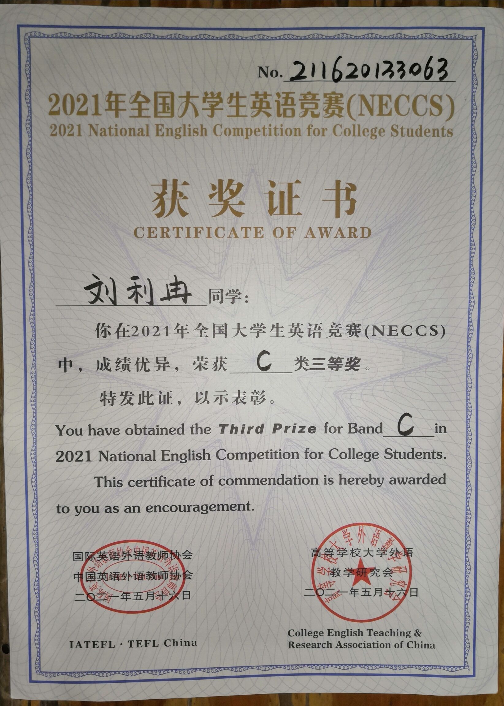 刘利冉于2021年5月16日荣获2021年全国老员工英语竞赛c类三等奖