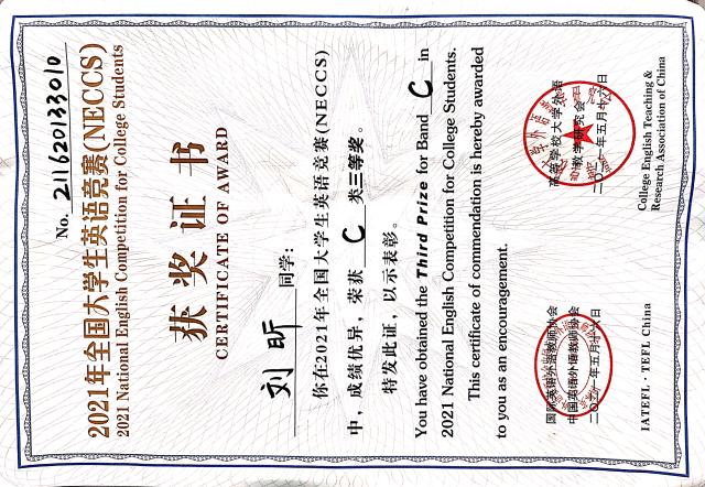 刘昕于2021年5月16日荣获2021年全国老员工英语竞赛c类三等奖