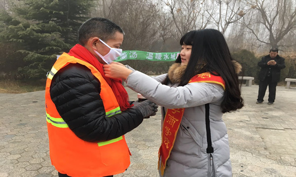 他们是城市的保卫者,迎来清晨的第一缕阳光,送走傍晚的最后一抹余晖,凛冽刺骨的寒风无情的刮伤他们的脸颊,英国be365官网社会实践队发起给环卫工人送温暖的活动。社会实践队成员率先准备好口罩围巾等保暖用品,联系好附近环卫工人,安排好人员分工以及其所负责工作,以保证活动的顺利进行。环卫工人到场后,社会实践队成员亲自为他们分发物品,并且为他们佩戴口罩和围巾。双方亲切交谈,彼此交流心得体会,环卫工人表示对社会实践队的活动很感激欣慰。