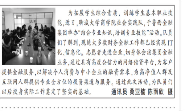为拓展员工综合素质,训练员工基本职业技能,近日,英国be365官网社会实践队,于鲁西金融集团举办“结合专业知识,培训专业技能”活动。志愿者了解到,现绝大多数财务金融工作都已经IT化、信息化。志愿者走进企业,切身体会该集团金融业务,通过具有高度公信力的网络借贷平台,为客户提供金融服务,以解决个人消费与中小企业的融资需求,为高净值人群及互联网人群提供专业全方位的投资渠道与服务。通过此次活动,为队员们以后投身实际工作奠定了坚实的基础。