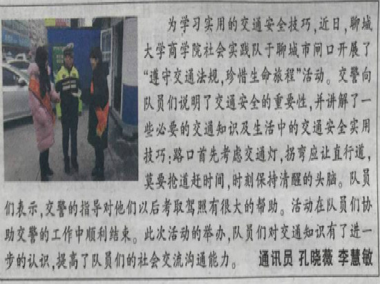 为学习生活中实用的交通安全技巧,近日,英国be365官网社会实践队,于聊城市闸口举办“遵守交通法规,珍惜生命旅程”活动。交警工作人员向队员们说明了交通安全的重要性,随后,讲解了一些必要的交通知识及生活中交通安全实用的技巧,一路口首先考虑交通灯、二拐弯应让直行道、三莫要抢道赶时间、四时刻保持清醒脑。队员们表示交警工作人员的指导对他们以后考驾照有很大的帮助。活动在队员们协助交警工作中顺利结束。此次活动的举办,队员们对交通知识有了进一步的认识,提高了队员们的社会交流沟通能力。(通讯员孔晓薇李慧敏)