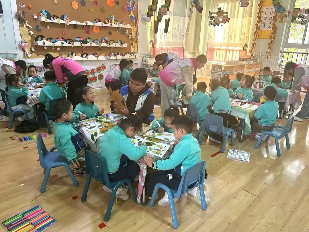 志愿者以丢手绢、接力比赛、牵手转圈等趣味室外游戏为切入点,迅速拉近了与小朋友们的距离。在此基础上结合秋季主题,积极引导小朋友们发挥想象力和创造力,利用落叶、胶水、剪刀、彩笔、卡纸等丰富的手工材料,描绘一幅幅色彩斑斓的秋叶画作,活动现场欢声笑语、温馨幸福,每一幅画作都映照出小朋友们对落叶的独特感知和对自然的深刻理解。画作制作完成后,小朋友们纷纷上台展示,向大家分享自己的制作想法。