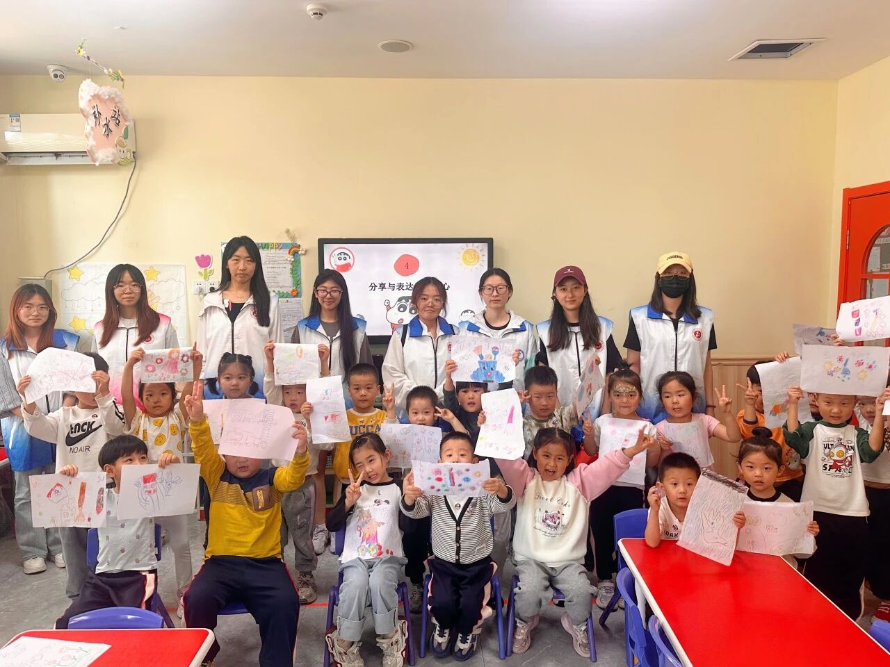 志愿者结合PPT和相关视频,帮助小朋友们深入了解五一国际劳动节的由来,并结合具体生活实例,生动展现了在日常点滴中的劳动现象,深入阐释了劳动精神的丰富内涵。互动问答环节,小朋友们积极抢答屏幕上出现的劳动者形象,现场气氛热烈活泼。在志愿者的悉心引导下,小朋友们拿起画笔,描绘心中的劳动场景。每一幅充满童真的画作,都凝聚着孩子们对劳动者的敬意,也承载着他们对劳动精神的独特理解。绘画结束后,小朋友们捧着作品勇敢上台分享创作故事,用稚嫩的语言讲述对“劳动最美”的感悟,真诚的表达感染了在场所有人,现场掌声与欢笑声此起彼伏。