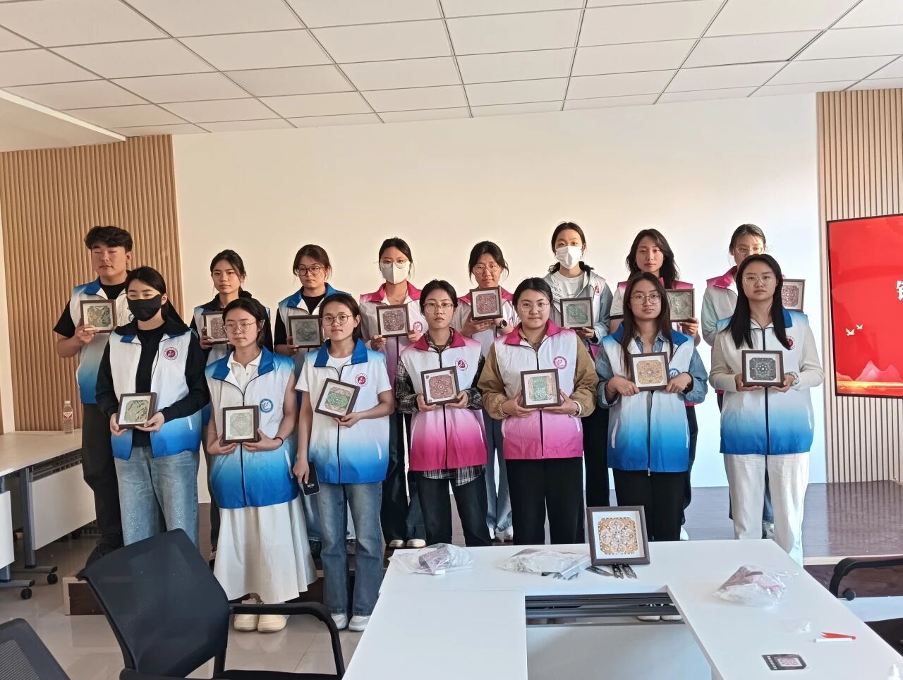 为促进非物质文化遗产传承与现代社区文化融合,5月8日,2023级4、5班李杉杉、孙玉颖等20名志愿者赴东昌府区王口社区开展"锦绣华彩 珠绘非遗"宋锦珍珠画创作实践活动,通过文化讲解与手工实践相结合的方式,带领社区居民探寻千年丝绸文明的时代新韵。