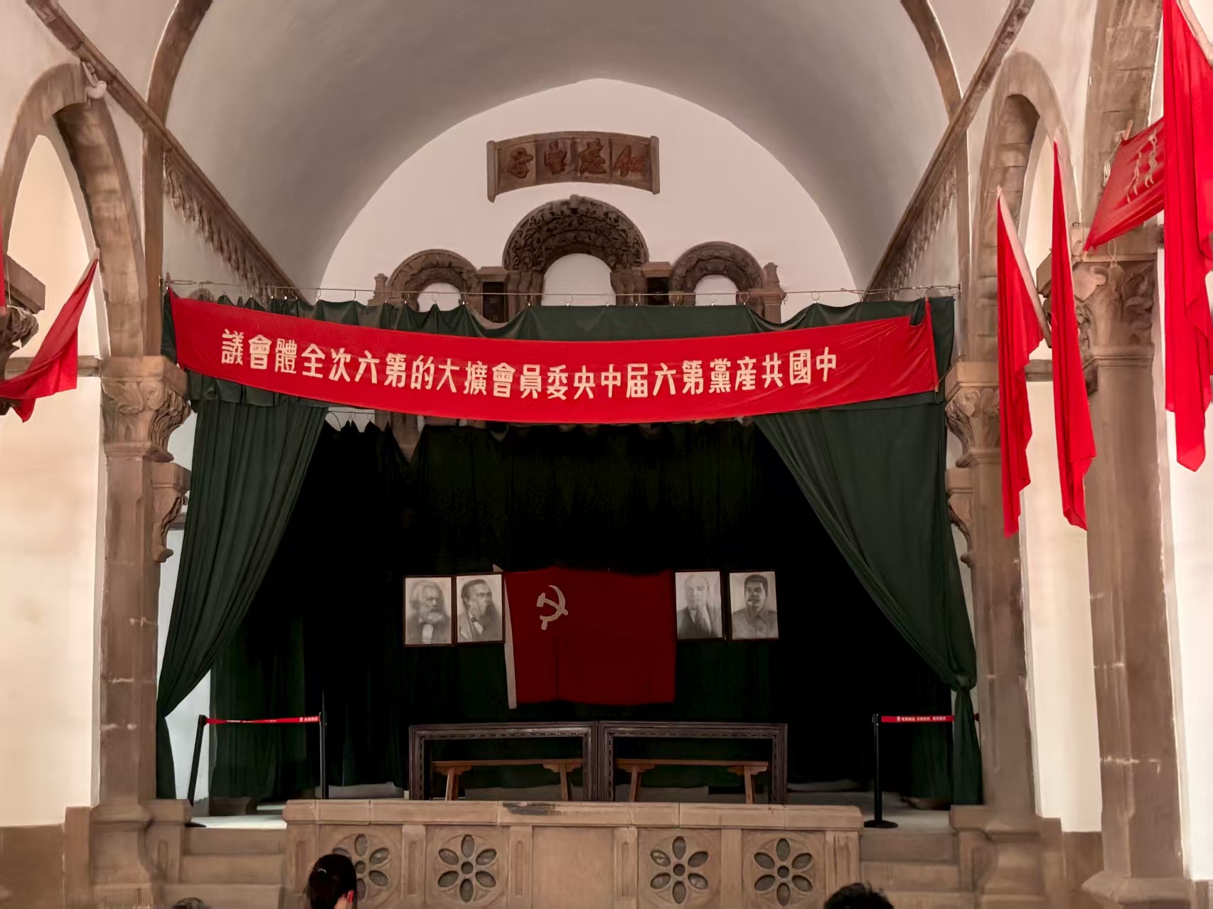 随后,实践队抵达六届六中全会旧址。1938年9月29日至11月6日,在这座庄严肃穆的教堂内,中国共产党扩大的六届六中全会在这里召开。全会科学总结了我党17年经验,正确分析了抗战以来的形势,规定了党在抗战新阶段的任务,为实现党对抗日战争的领导进行了全面的战略规划。毛泽东曾在党的七大上说:“六中全会是决定中国之命运的。”