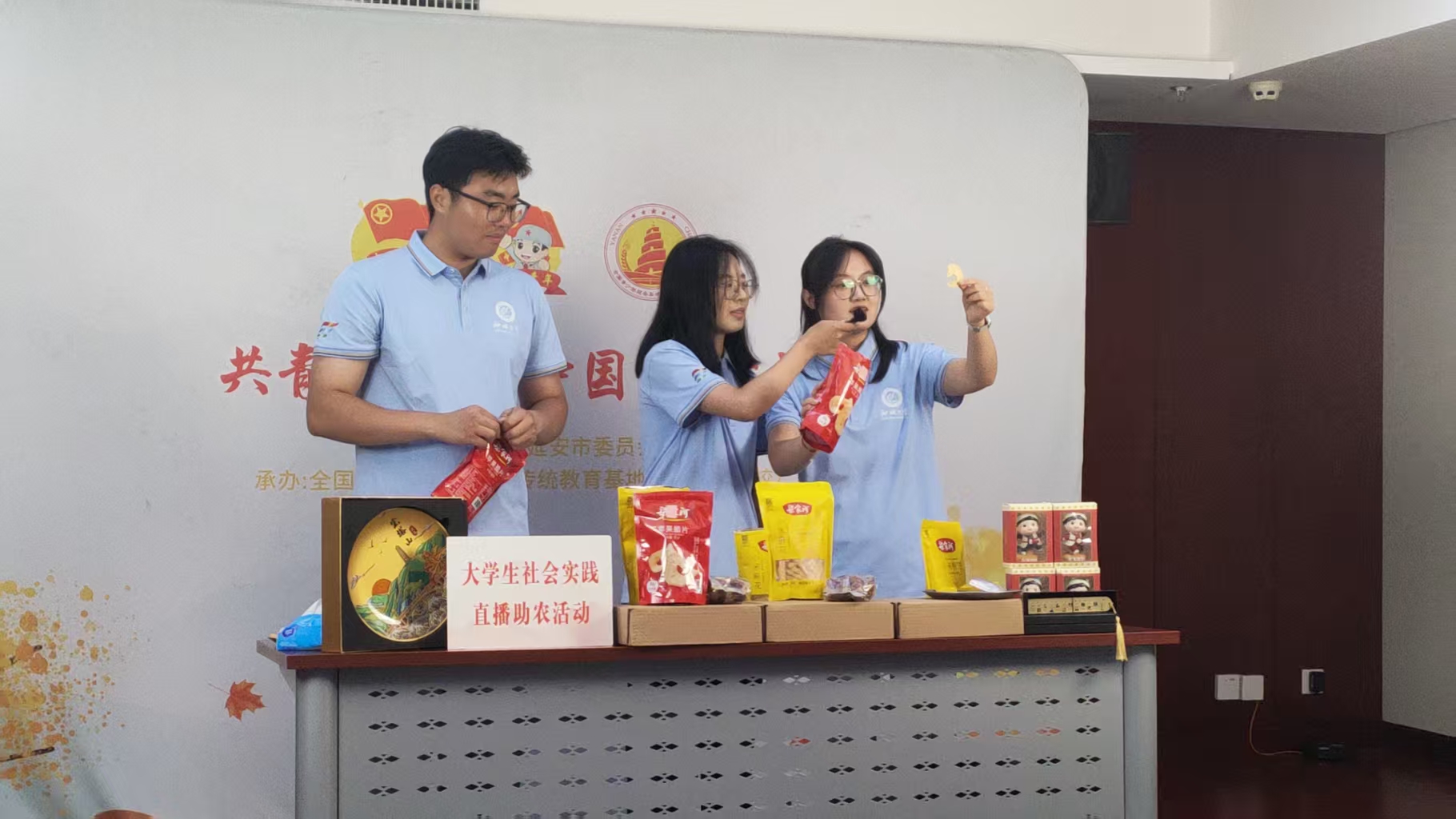 直播现场,队员们化身带货主播,热情洋溢地向观众介绍延安苹果脆片、狗头枣等优质农特产品。除详细讲解产品的特点和优势外,他们更将白天在梁家河、革命旧址的所见所感融入其中,讲述这些农产品背后蕴含的延安精神与红色文化,为直播注入了独特的情感温度和人文内涵。