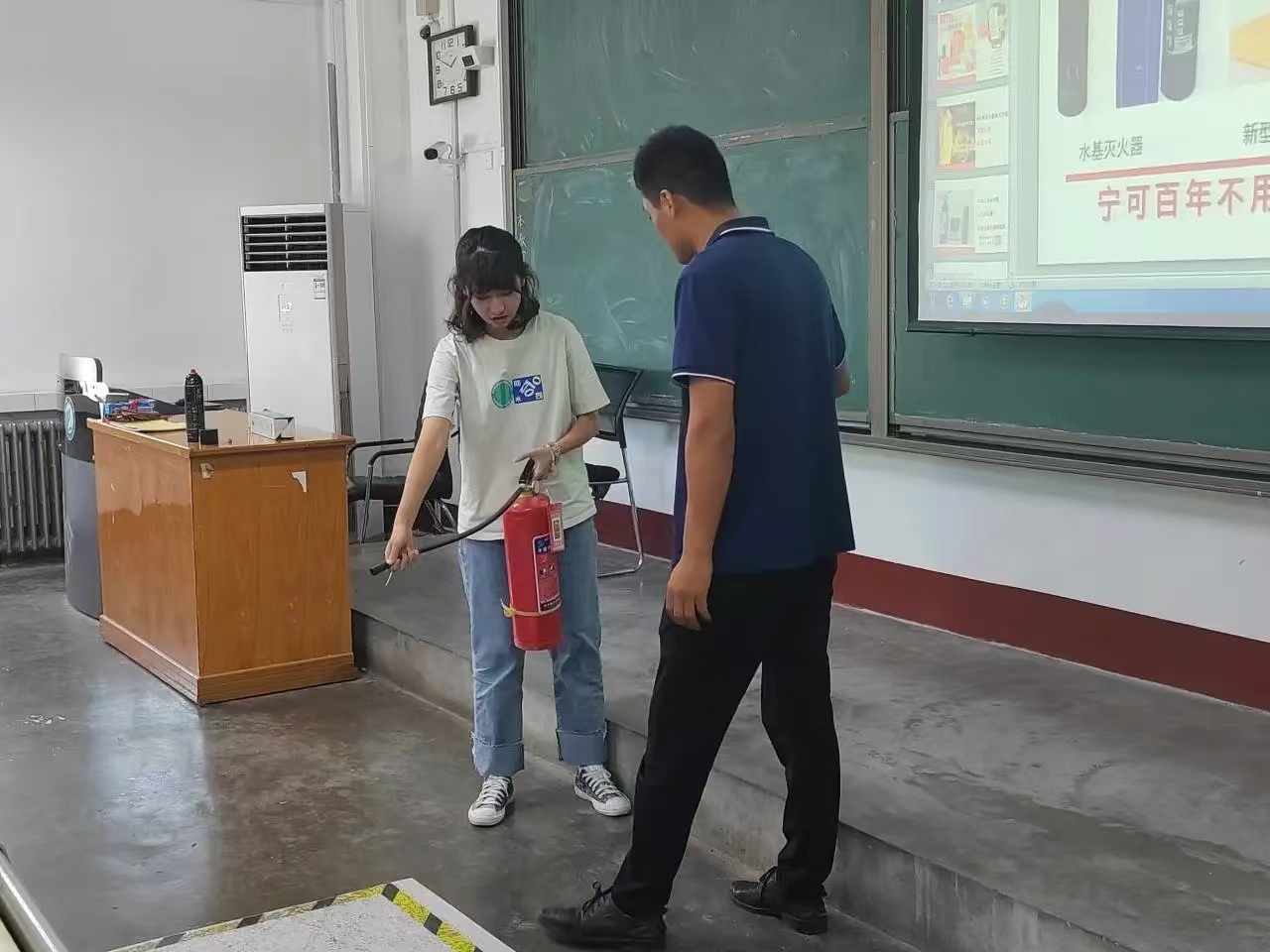 在实操演练环节,主讲人演示了灭火器的正确使用方法、步骤和灭火姿势等,并邀请员工现场体验。活动最后,辅导员王高平指出,同学们应积极树立消防安全意识,时刻保持警惕心理,防患于未然,努力创建平安校园。