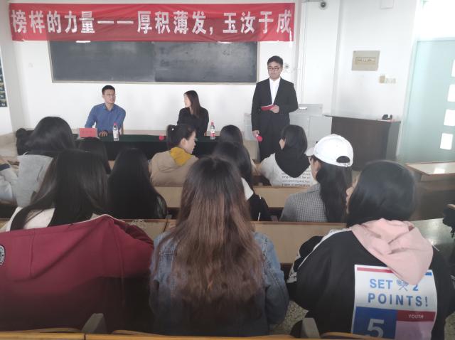 “人不率,顺不从;身不先,则不信。”“厚积薄发,玉汝于成”榜样的力量是无穷无尽的。本着亲近同学贴近实际的原则,此次活动将采用邀请优秀的学长学姐分享经验的讲座形式。伴着主持人浑厚的声音本次活动正式拉开帷幕。首先是法公司的孙盼盼学姐通过PPT为我们讲述她的奋斗和努力。学姐分别从英语成绩的重要性、学业培养与发展、任职情况等方面作了详细解析。李钦伟学长的演讲风格是成熟稳重的,他从员工工作方面向同学们分享自己的工作和生活经验。最后的提问环节,同学们纷纷根据自己的实际情况向学姐学长提问。不管是考研与就业的关系、工作与学习的平衡还是说调皮的同学们的对恋爱观的探讨,学姐学长们都认真作答。