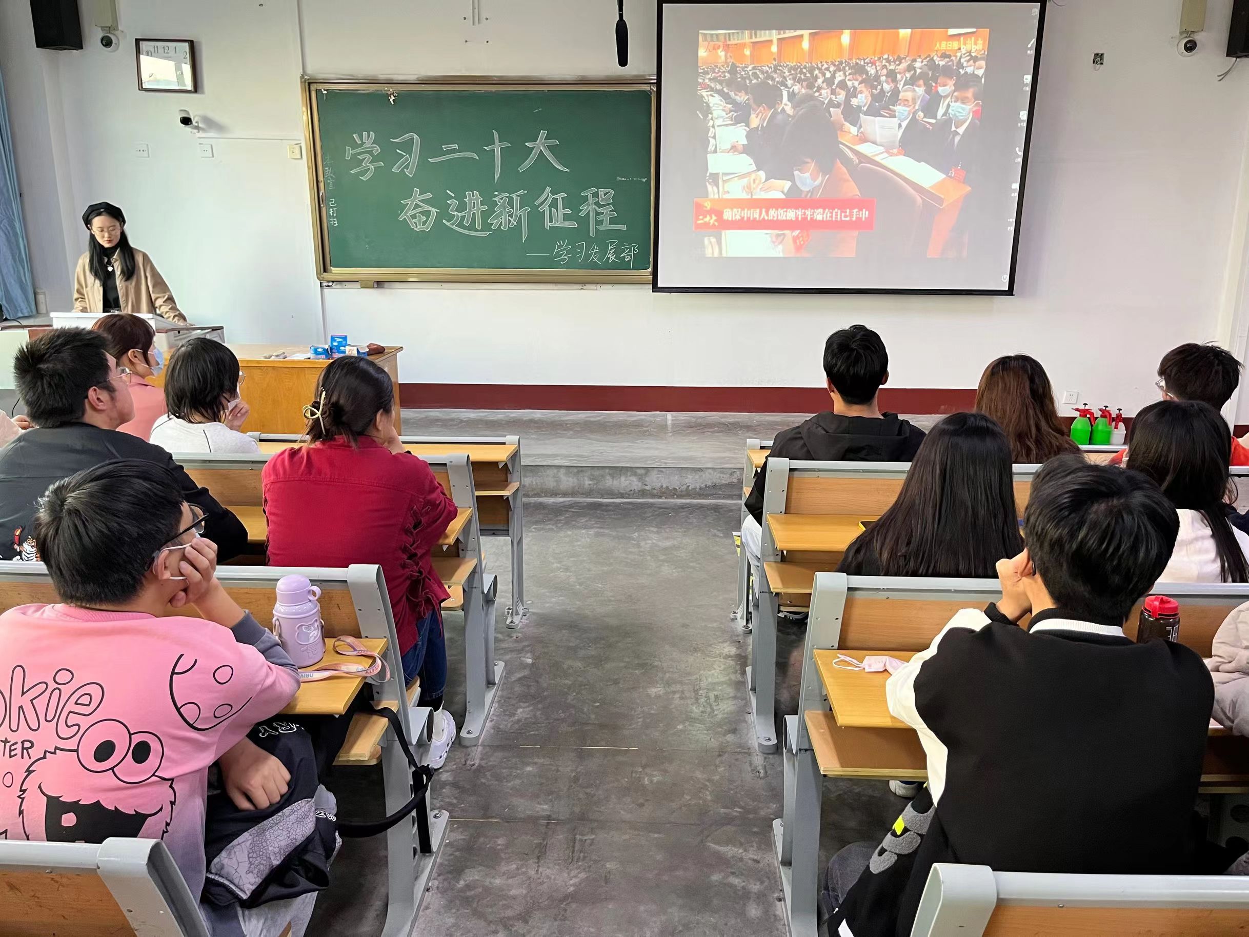 活动伊始,主讲人简述了新时代以来三件对党和人民事业具有重大现实意义和深远历史意义的大事:一是迎来了中国共产党成立一百周年;二是中国特色社会主义进入新时代;三是完成了脱贫攻坚、全面建成小康社会的历史任务并实现了第一个百年奋斗目标。随后,主讲人播放了习近平总书记关于学习贯彻党的二十大精神要做到的“五个牢牢把握”的视频,内容深刻丰富,发人深思,引人深省,催人奋进。紧接着,主讲人深入讲述了其具体内涵,在场同学认真聆听,反响热烈,倍受鼓舞的同时也深刻感受到了所肩负的责任与使命。活动最后,同学们纷纷表示将牢记习近平总书记的嘱托,勇挑重担,冲锋在前,砥砺奋斗,展现新时代青年的新担当新作为。
