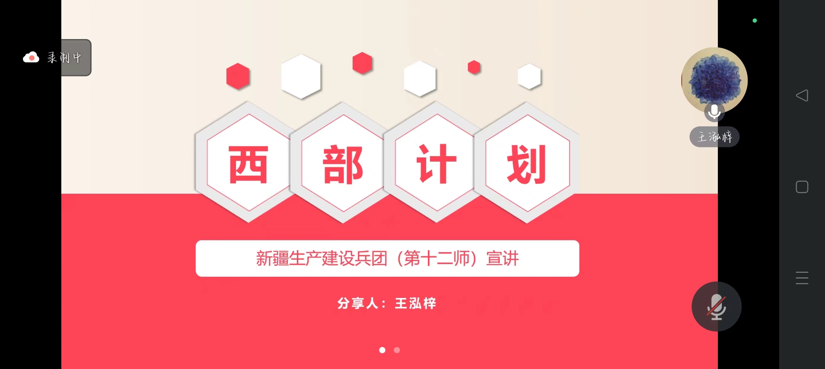 以青春之名,赴西部之约。王泓梓现服务于新疆生产建设兵团第十二师,拥有丰富的基层服务经验。他结合自身志愿服务的经历,从西部计划简介、保障机制、工作介绍等多个方面进行了讲解,简单介绍了西部计划服务内容的八个专项,详细解读了各专项的具体内容和服务目标,分析了国家对于西部计划志愿者的政策支持、生活保障及考核激励。他强调,参加西部计划对个人的成长和发展具有重大意义,西部计划不仅仅是履历上的证明,而是成长道路上的宝贵经验和财富。活动最后,王泓梓鼓励同学们积极投身到西部计划的志愿服务工作中,用青春传递志愿的火种,用行动践行青年的使命,为西部建设及乡村振兴贡献青春力量。
