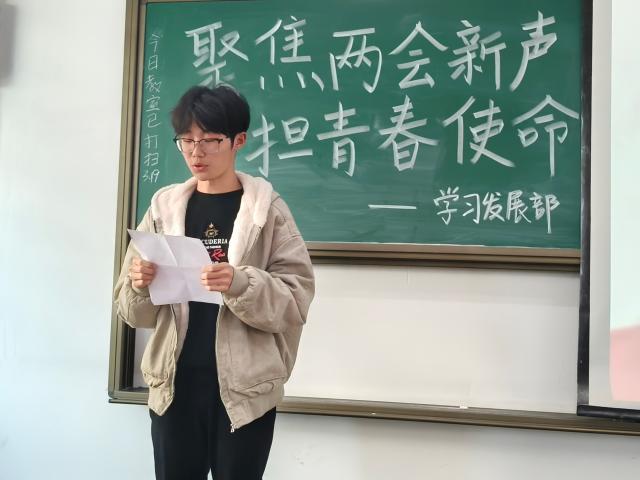 孔鑫瞳借助文案与视频,清晰地为同学们梳理了两会的主要议程与重要成果,并带领大家深入解读了两会核心精神,从国家发展战略到民生福祉改善,全方位地剖析了两会传递出的关键信息。此外,他着重阐述了如何用青春践行两会精神,鼓励同学们立足当下,努力学习专业知识,积极投身社会实践,以实际行动响应两会号召。