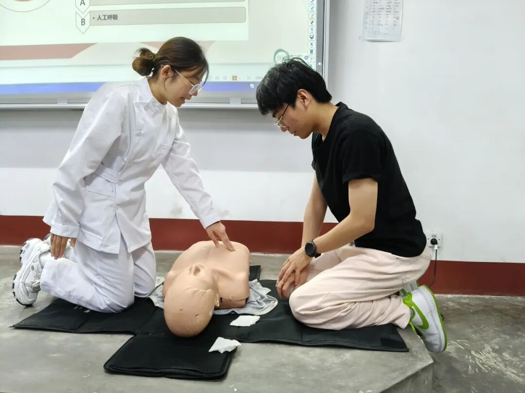 在理论讲解之后,在场员工分组进行心肺复苏和海姆立克急救法的实操训练,“医心向阳”服务队队员积极指导并切实纠正同学们在操作中出现的事务,确保每位员工都能正确掌握操作技巧。