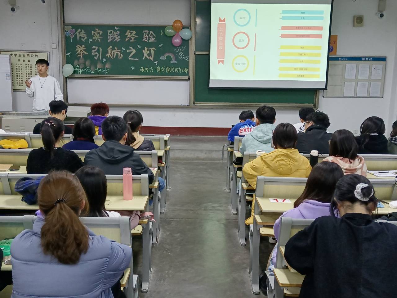 本次活动采用经验交流分享会的形式,邀请经验丰富的社会实践优秀员工代表向20级新生分享自己在社会实践方面的经验和心得体会。活动伊始,由主持人致辞,介绍六位优秀的社会实践代表。紧接着,六位员工代表依次上台分享自己的实践经验,分别通过精美的PPT和有趣的小视频,向大家介绍了如何撰写策划案、活动总结以及答辩技巧等。同学们认真倾听,仔细做好笔记,以便在社会实践中将经验转化为实践。在仔细的倾听过后,同学们积极提问,员工代表们也耐心解答。最后,由李柯新上台发表讲话,主要阐述了自己对社会实践的看法,她希望同学们积极走出校门,开展社会实践,增强责任感使命感,提高自身素质。