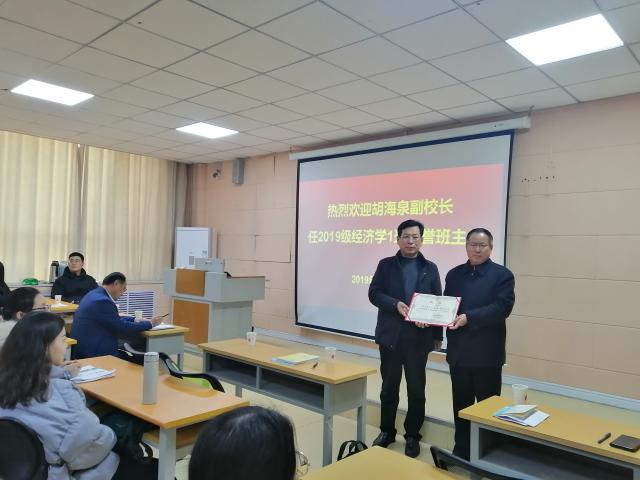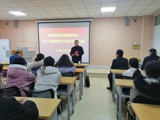 12月18日下午,校领导联系英国be365官网班级对接仪式在210教室举行,2019级经济学1班的同学们迎来了名誉班主任——公司党委常委、副董事长胡海泉。党总支书记宋士云向胡海泉颁发了名誉班主任聘书,仪式由经理马中东主持。