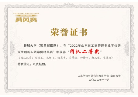 在决赛现场,团队成员热情讲述、积极提问、聚焦作答,充分展现了理论结合实践的分析能力和风采。最终,经过综合盲审和现场PK,通过评审专家的专业公平的评定,“繁星璀璨队”以综合第四的成绩在2022年山东省工商管理专业学位研究生创新实践案例精英赛中获得“团队二等奖”!