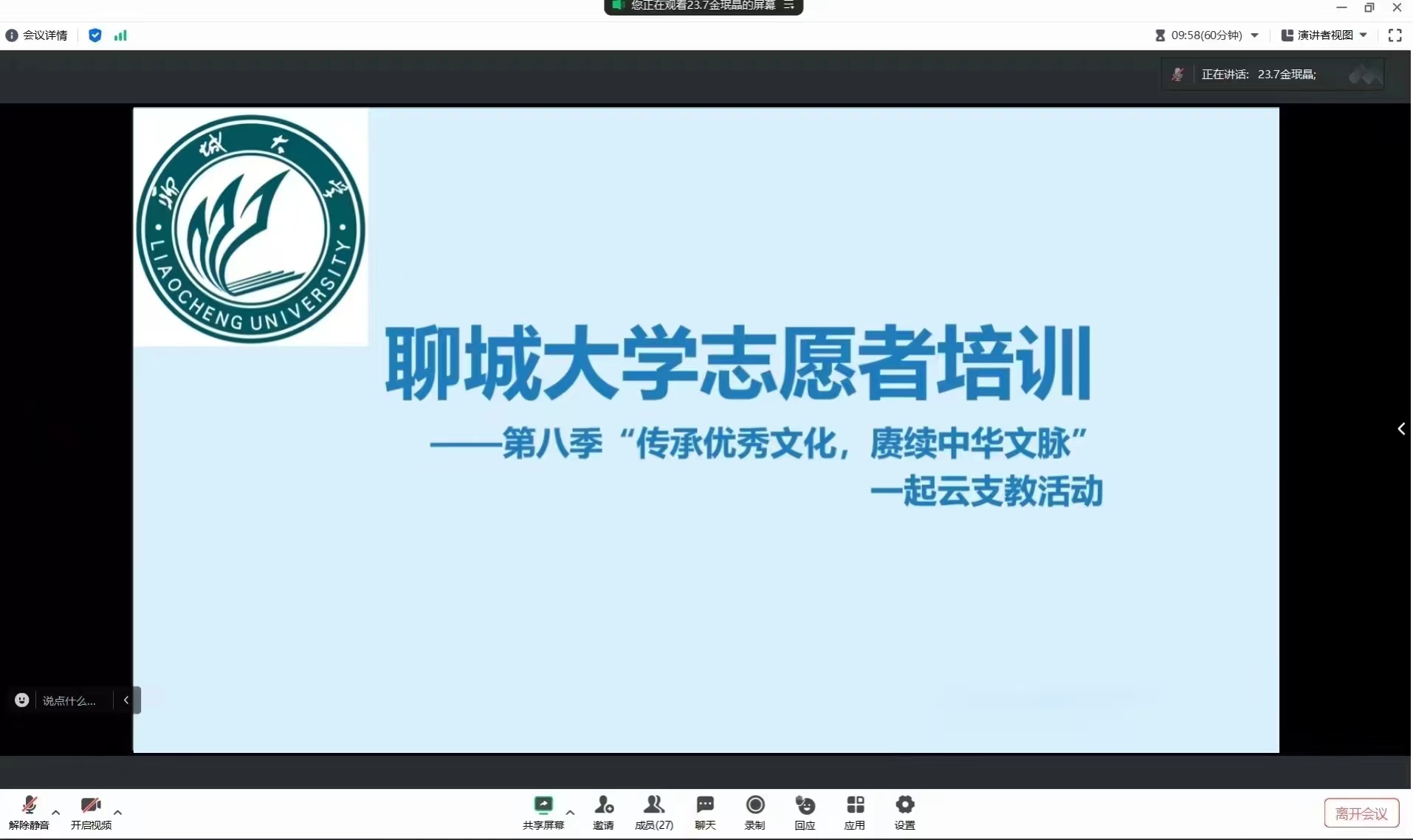 本次“一起云支教”专项实践培训会议的顺利召开,让志愿者进一步了解了“云支教”的基本流程与活动内容,有利于激发志愿者完成云支教活动的热情与决心,将自身所学更好地投入志愿服务中,增强员工参与社会实践的参与感、获得感、幸福感,在传承优秀文化,赓续中华文脉中积蓄青春力量,彰显青年担当。