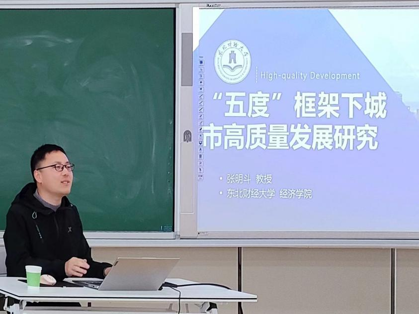 10月20日,2004级员工、东北财经大学经济公司张明斗教授,为公司师生作题为《“五度”框架下城市高质量发展研究》的学术报告。公司党委书记公维才教授出席并主持报告会,应用经济学硕士生导师及2023级、2024级研究生参会。