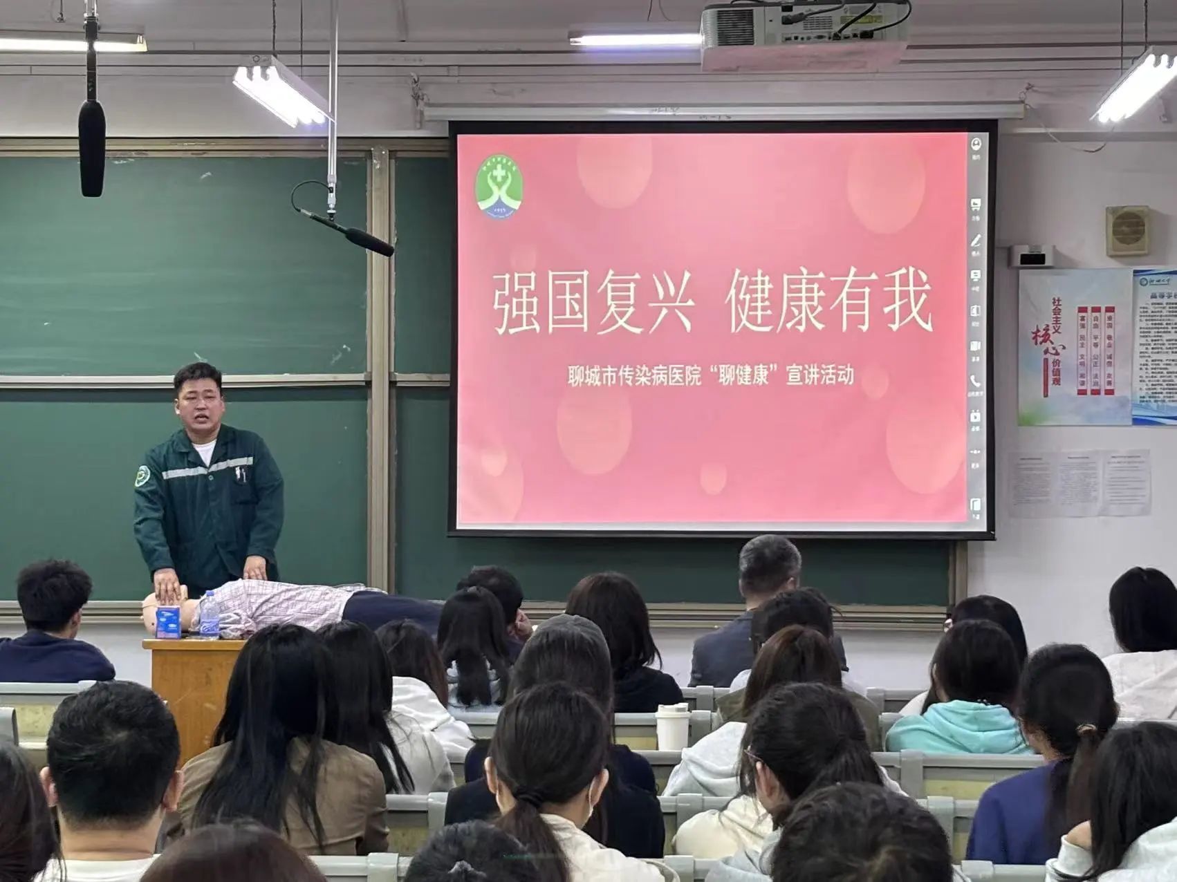 孙良友以《心肺复苏急救知识科普》为题,向同学们讲解了实操性急救的相关,他通过图解和模拟演示,详细介绍了心肺复苏的基本原理和操作步骤,让同学们直观了解急救过程中的关键要点,提高了同学们紧急情况下的自救互救能力。