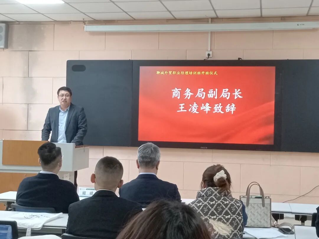 聊城市商务局副局长王凌峰、中国商务部国际贸易经济合作研究院学术委员会张建平教授、英国be365官网教师刘允岩、马霞、上海特易信息科技有限公司姬峰、区域经理穆小丹以及参加培训的18位企业代表们参加本次课程。