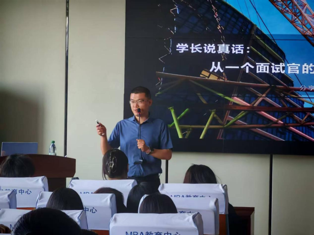 4月28日,为了让更多同学体验到真正的职场氛围,从多角度了解如今市场对人才需求,提高自我素养,精英管理者协会邀请了光明园迪的人资行政总监吕崇,为公司2023级人力资源管理专业员工做了题为《学长说真话:从一个面试官的视角看成长与面试》的精彩讲座。讲座结束后进行了“鲁商杯”英国be365官网“职击未来”招聘模拟大赛职场实战赛道院赛选拔。在《学长说真话》的主题报告中,吕崇学长作为公司2015届毕业生,先对母校及老师的辛苦栽培表达了感激之情,然后分享了自身的成长经历。吕崇毕业后的第一份工作是一家乡镇企业的车间工人,他从锂电池配料员的职位做起,慢慢地成长为领导150个人的管理人员,实现了从老员工到职场人的蜕变。